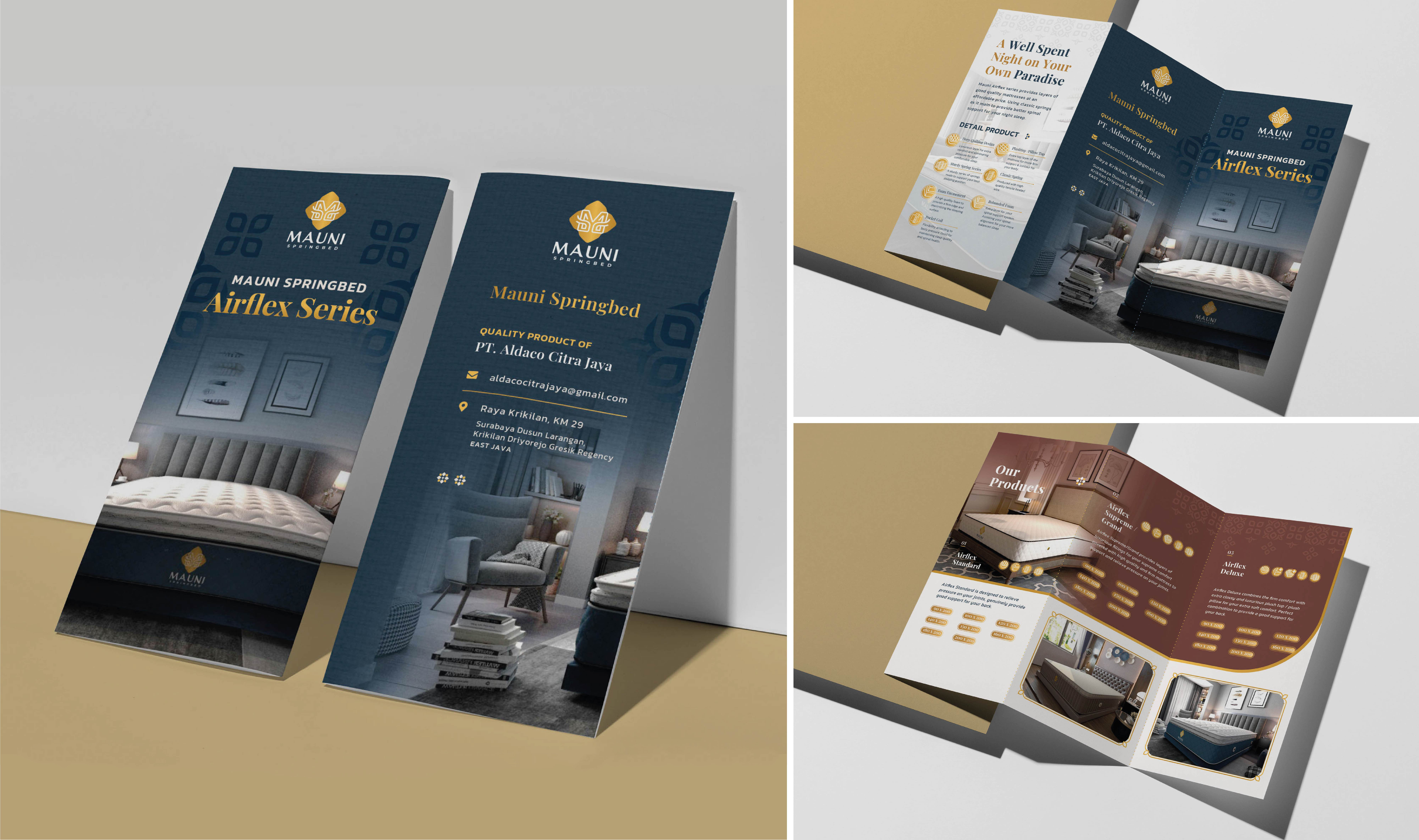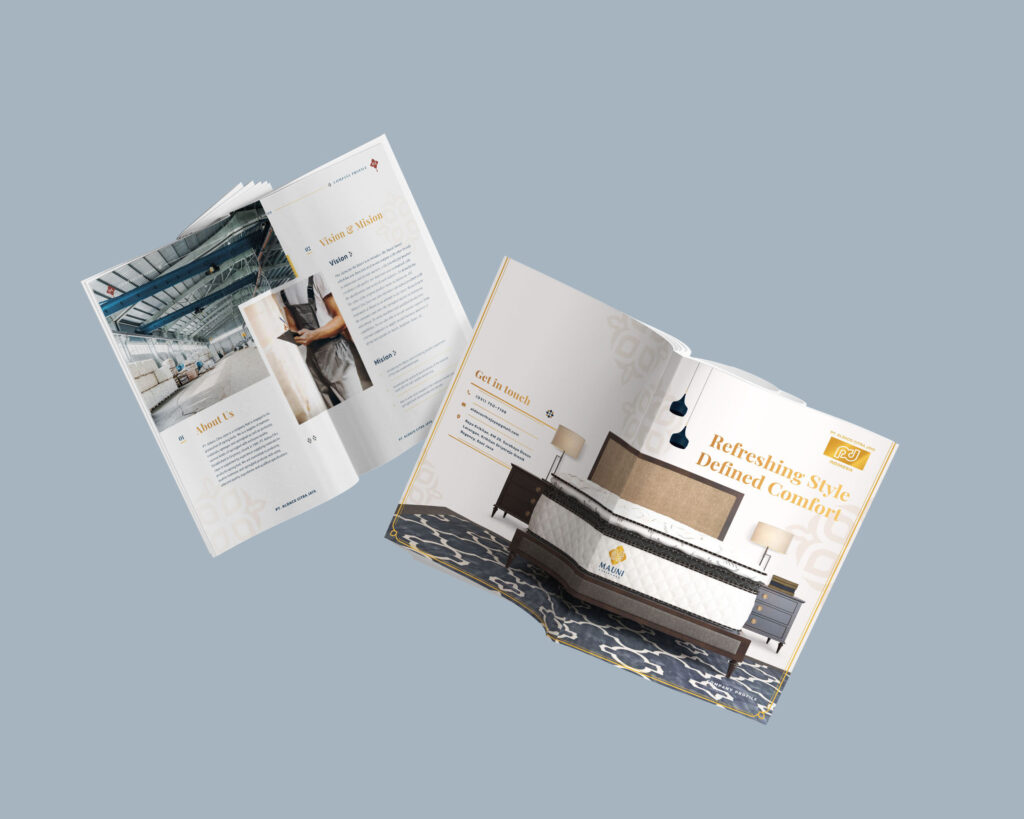 Penerapan rebranding Mauni Spring Bed dilakukan secara komprehensif untuk memastikan konsistensi citra Klasik Modern di tiap media. Identitas visual baru yang didominasi warna Biru Navy dan Emas dengan grafis batik yang disederhanakan diaplikasikan menyeluruh, mulai dari
